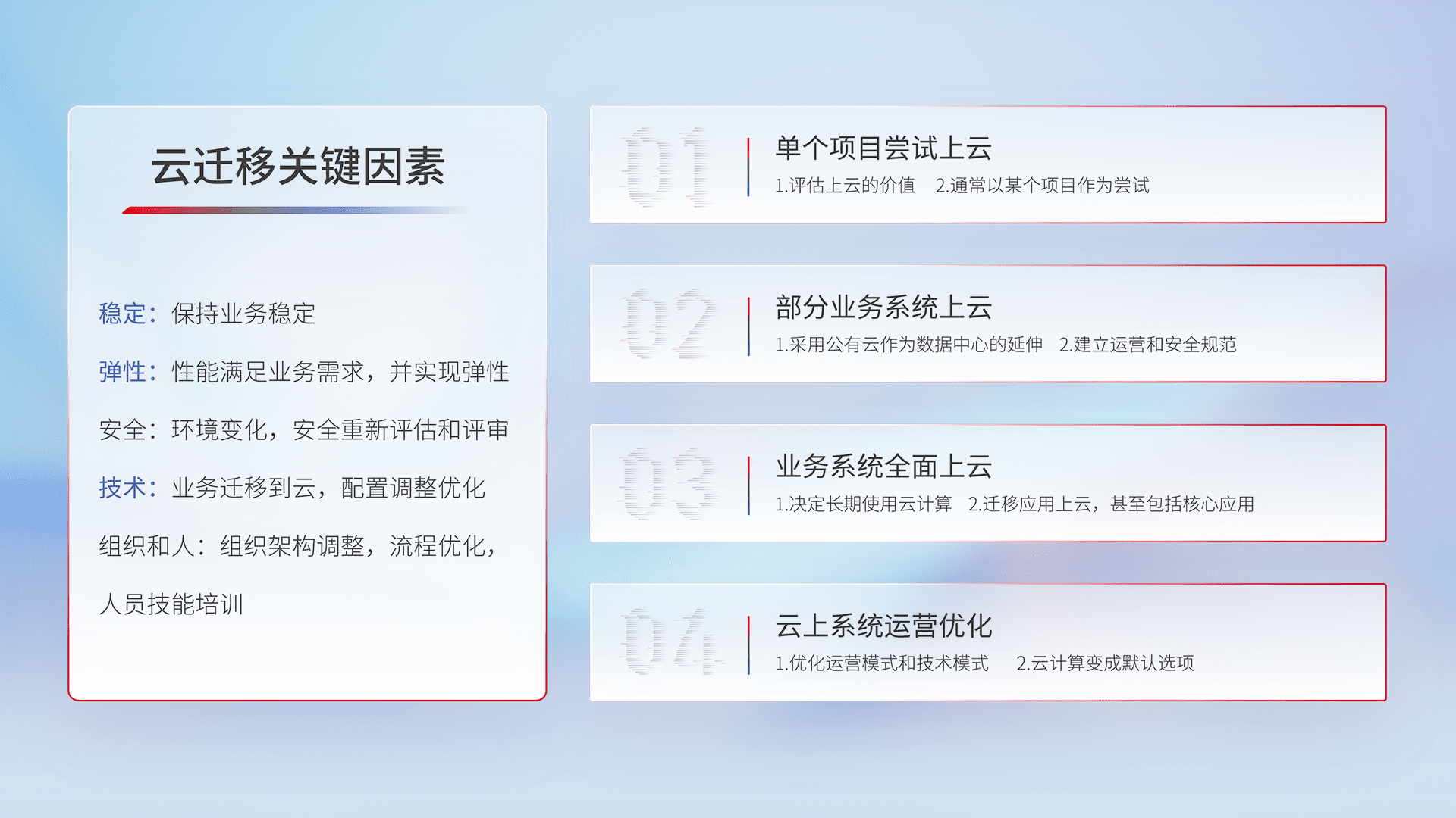 结合实际业务,,,从规划设计、、、、云平台选型、、、云原生改造、、数据迁移、、、、集成交付,,,迁移全过程为客户识别最佳上云路径,,,做好风险识别管理,,,,设计网络架构、、身份权限、、、安全审计合规、、、、操作审计、、日志审计、、、、监控告警策略、、、、多站点容灾设计等,,,对云上基础设施进行整体规划,,,提升IT治理水平,,,以满足弹性、、、高可用、、、高性能的需求。。。