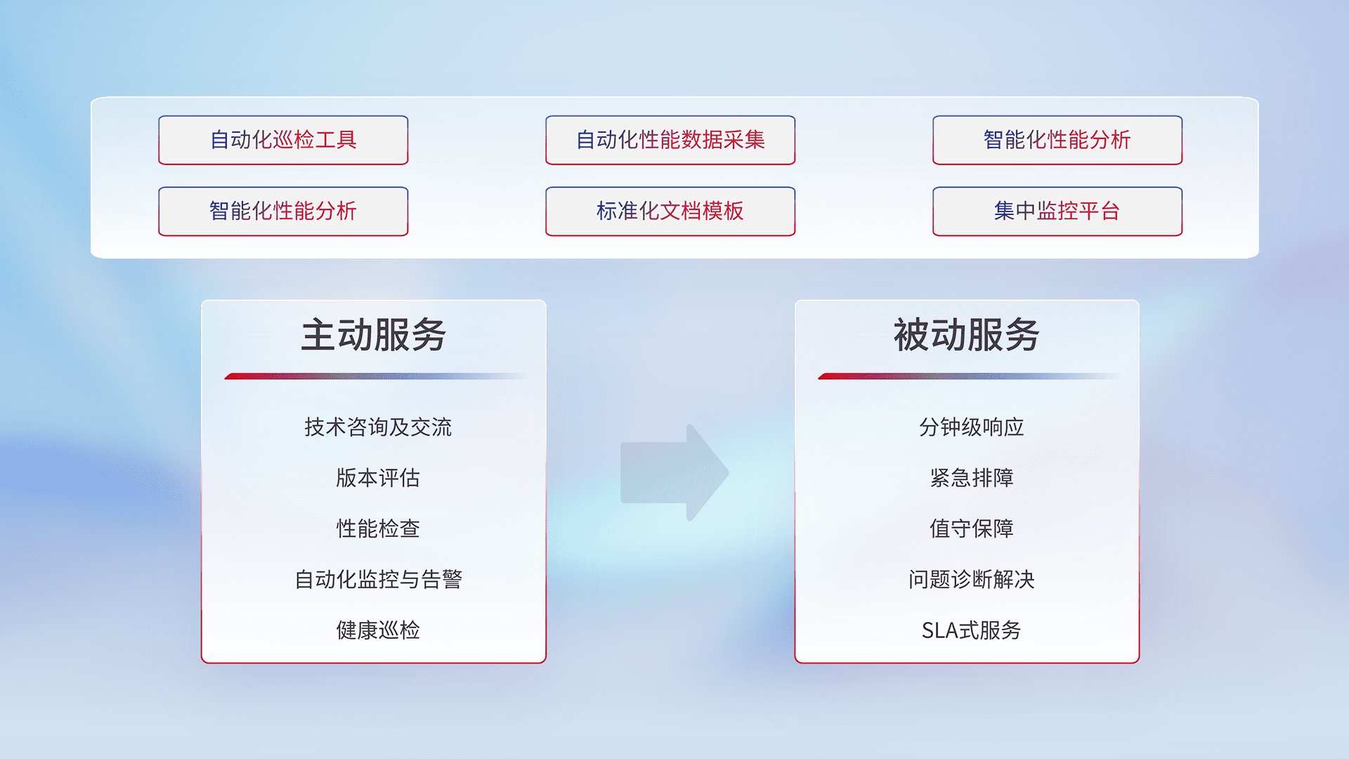 智能化工具和标准化文档,,,保障服务质量,,,提供主动服务(包含技术咨询、、版本评估、、、、性能检查、、、自动化监控与告警、、、健康巡检)和被动服务包含(分钟级响应、、、紧急排障、、、值守保障、、、、问题诊断解决、、、SLA服务)。。。。